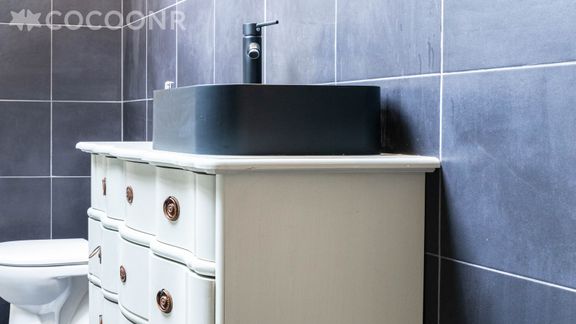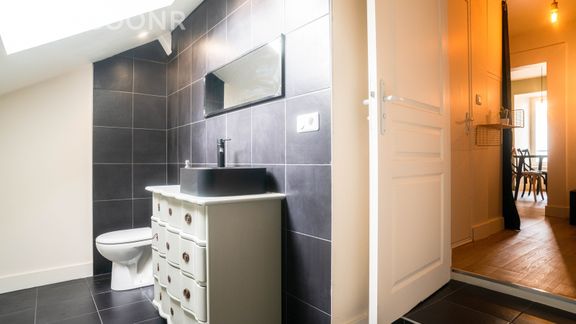 - Une salle de bain avec douche à l'italienne, meuble vasque et WC