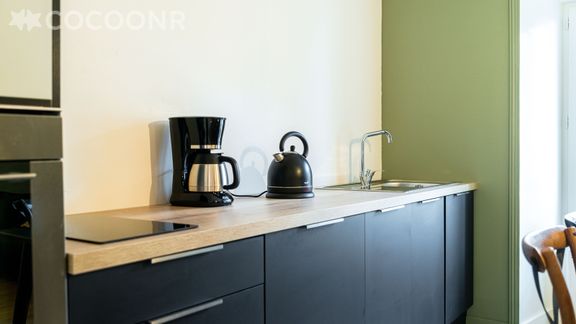 - Une cuisine équipée avec notamment : four micro-ondes combiné, lave-vaisselle, cafetière Nespresso, bouilloire, vaisselle...