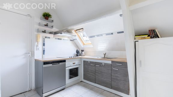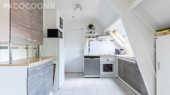 - Une cuisine ouverte équipée avec notamment : bouilloire électrique, four, four à micro-ondes, grille-pain, lave-vaisselle, plaques de cuisson, hotte, réfrigérateur, congélateur, cafetière à dosettes Senseo...