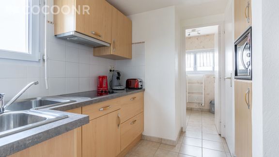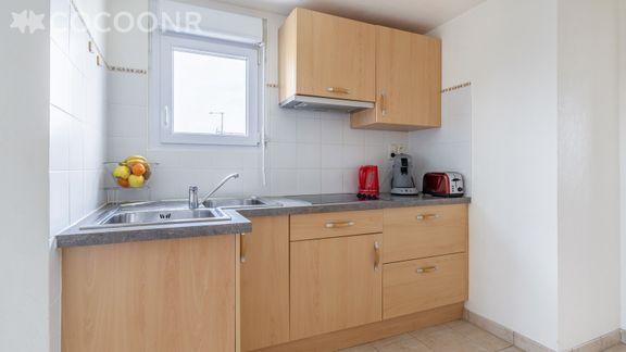 - Une cuisine fonctionnelle et entièrement équipée : réfrigérateur, four, plaques à induction, micro-ondes, grille-pain, bouilloire, cafetière à dosettes Senseo…