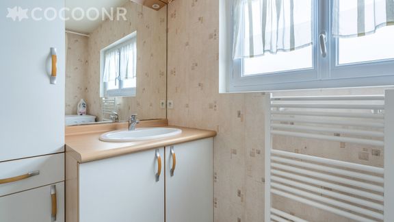 - Une salle de douche avec meuble vasque, sèche-serviettes et lave-linge