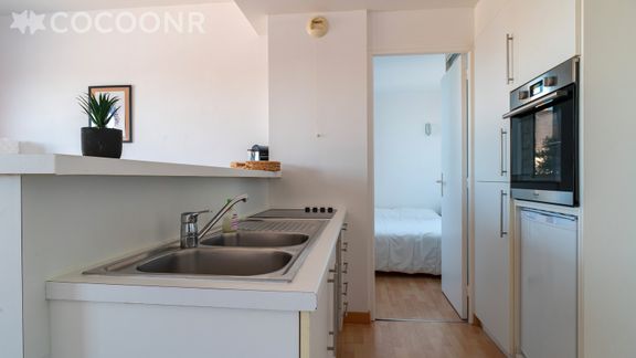 - Une kitchenette, ouverte sur le séjour, équipée avec notamment : bouilloire électrique, four, four à micro-ondes, grille-pain, plaques de cuisson...