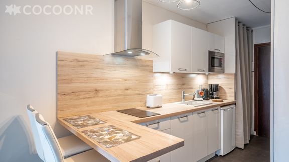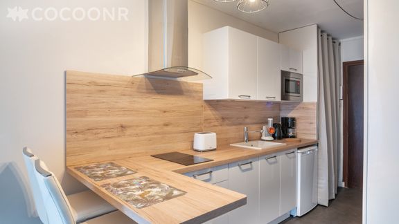 - Une cuisine ouverte équipée avec notamment : bouilloire électrique, four à micro-ondes, grille-pain, lave-vaisselle, plaques de cuisson, machine à café à filtre...