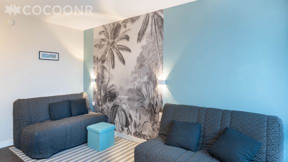 - Une pièce de vie de 18 m² avec TV, canapés dont un convertible (2 couchages) et coin repas.