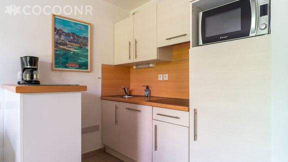 - Une cuisine, ouverte sur le séjour, équipée avec notamment : bouilloire électrique, four, four à micro-ondes, grille-pain, lave-vaisselle, plaques de cuisson...