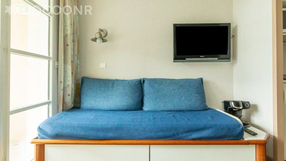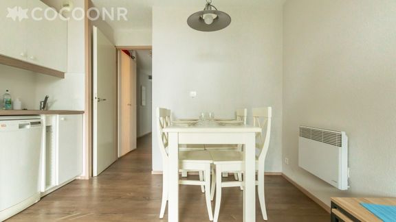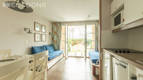 - Une pièce de vie de 15 m² avec TV, banquette-lit (2 couchages) et coin repas pour 4 personnes