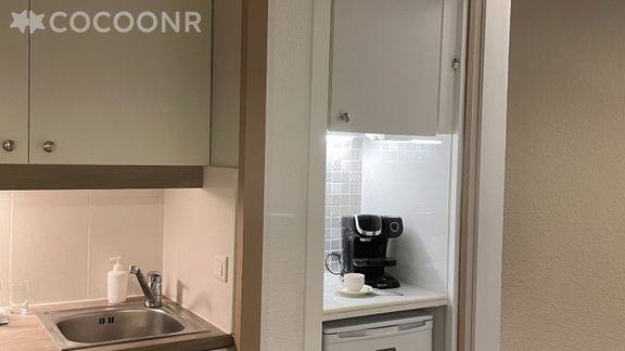 - Une kitchenette équipée avec notamment : bouilloire électrique, four à micro-ondes, grille-pain, lave-vaisselle, plaques de cuisson...