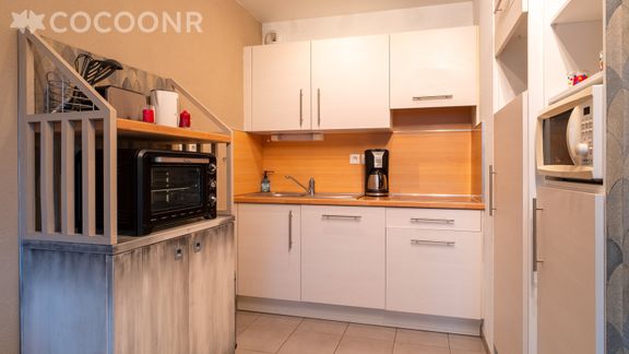 - Une cuisine équipée avec notamment : bouilloire électrique, four, four à micro-ondes, grille-pain, cafetière Nespresso, lave-vaisselle, plaques de cuisson, batteur électrique...