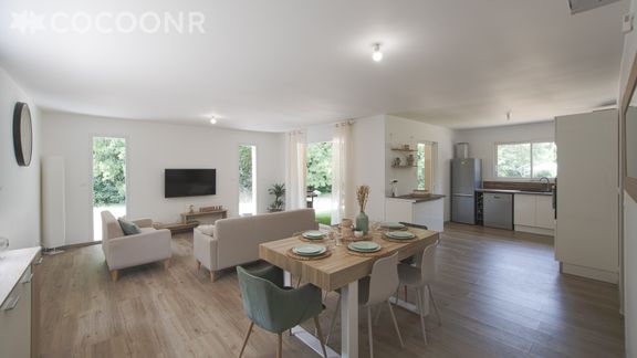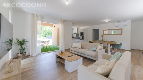 - Une pièce de vie climatisée de 45 m² avec canapés, TV, coin repas