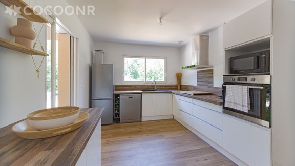 - Une cuisine équipée avec notamment : bouilloire électrique, four, four à micro-ondes, grille-pain, lave-vaisselle, plaques de cuisson...