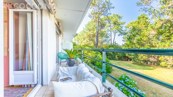 Offrant une atmosphère paisible et élégante, ce logement de 76 m² peut accueillir jusqu’à 4 personnes. Il bénéficie d’un balcon donnant sur un écrin de verdure, avec une vue imprenable sur de magnifiques arbres, dont des pins majestueux qui évoquent instantanément les vacances.