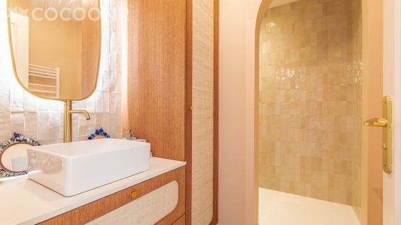 Le coin nuit se compose de deux chambres élégamment décorées. Une salle d'eau moderne avec douche à l’italienne complète l’ensemble, ainsi que des toilettes séparées pour plus de confort.
