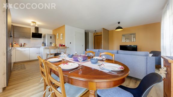- Une pièce de vie de 35 m² avec TV, canapé-lit double (deux couchages) et espace repas