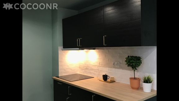- Une cuisine équipée avec notamment : bouilloire électrique, four à micro-ondes, grille-pain, plaques de cuisson...