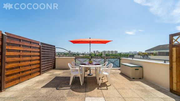 - Une terrasse de 20 m² exposée "Sud" avec parasol, table et chaises pour profiter des beaux jours