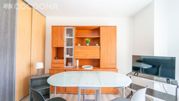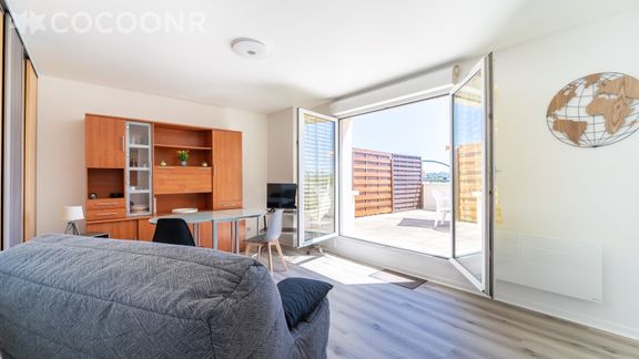 - Une pièce de vie de 20 m² avec canapé-lit double, TV, espace repas et accès balcon