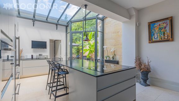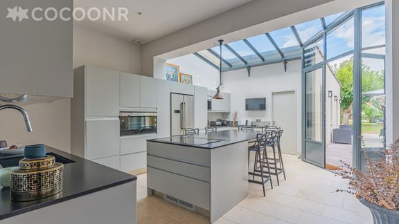 - Une grande cuisine équipée avec notamment : bouilloire électrique, four, four à micro-ondes, grille-pain, lave-vaisselle, plaques de cuisson... avec un accès directement au jardin et à la terrasse