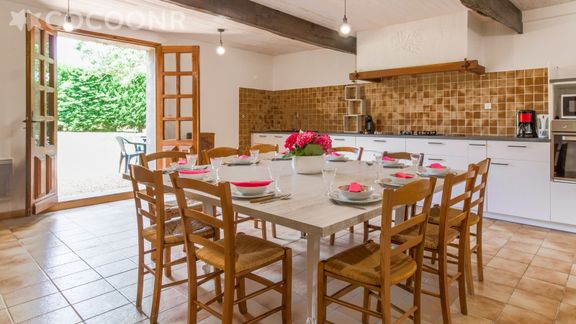 - Cuisine moderne de 60 m² entièrement équipée avec : table à manger en bois, 10 chaises, lave-vaisselle, four, plaques de cuisson, cafetière, grille-pain, bouilloire électrique, vaisselle et couverts. Accès à une terrasse exposée Nord, ombragée pour les repas de midi.