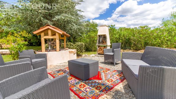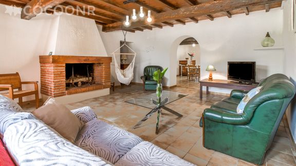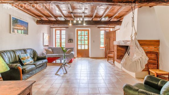 - Grande et belle pièce à vivre de 40 m² lumineuse grâce à son exposition sud aménagée avec 2 canapés, 2 fauteuils, hamac et table basse s'articulant autour d'une cheminée fonctionnelle.