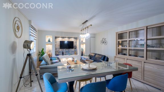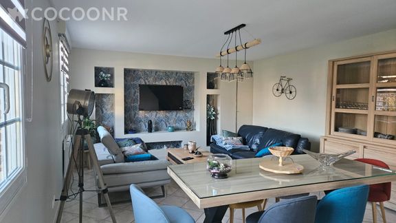 - Une pièce de vie de 30 m² avec canapés, TV, coin repas