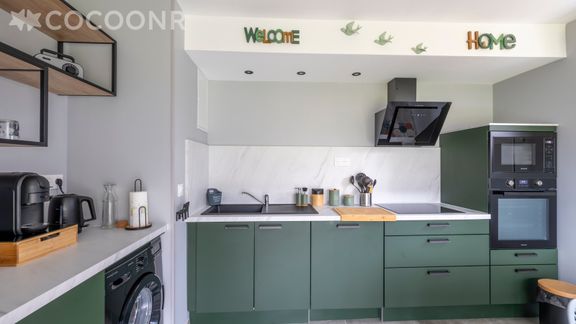 - Une cuisine équipée avec notamment : bouilloire électrique, four, four à micro-ondes, grille-pain, lave-vaisselle, plaques de cuisson...