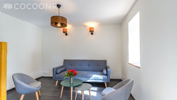 - Une pièce de vie de 33 m² avec canapé, fauteuils et espace repas.