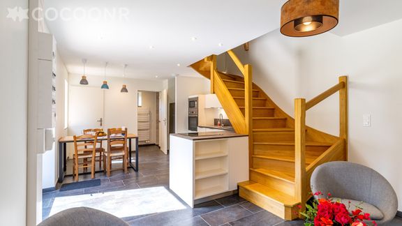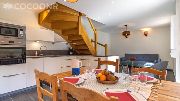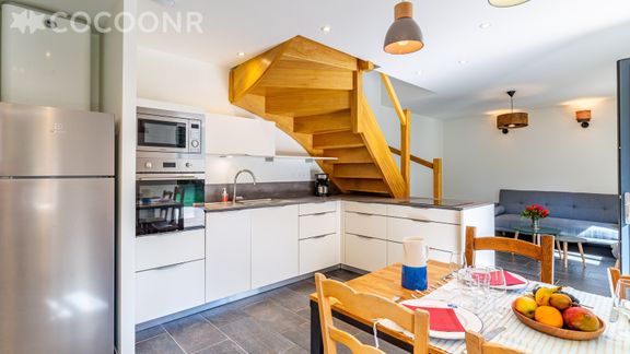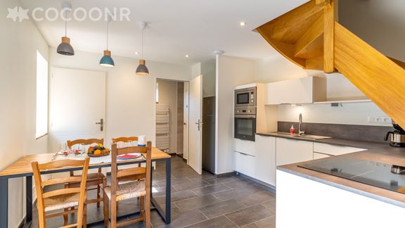 - Une cuisine ouverte équipée avec notamment : bouilloire électrique, four, four à micro-ondes, grille-pain, lave-vaisselle, plaques de cuisson, machine à café à filtre...