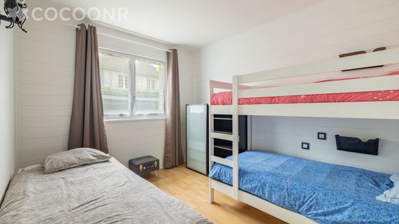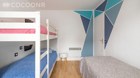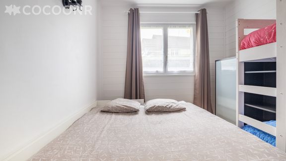 - Chambre 1 : un lit superposé (2 couchages simples 90 cm x 190 cm) et un lit banquette simple qui se transforme en lit double une fois déplié.
