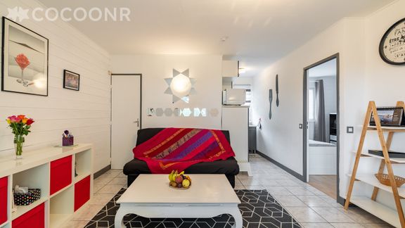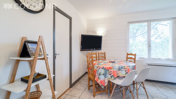 - Salon-séjour aménagé avec un canapé-lit, une table basse, une TV, un espace repas pour 6 convives.
