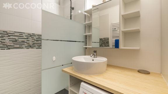 - Salle d'eau avec une douche à l'Italienne, une vasque, une machine à laver, un sèche-cheveux.