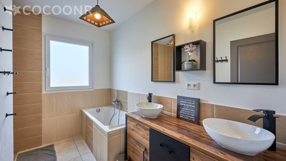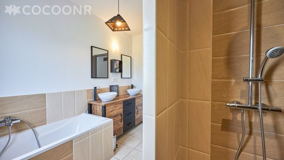- Une salle de bain avec douche à l'italienne et baignoire.