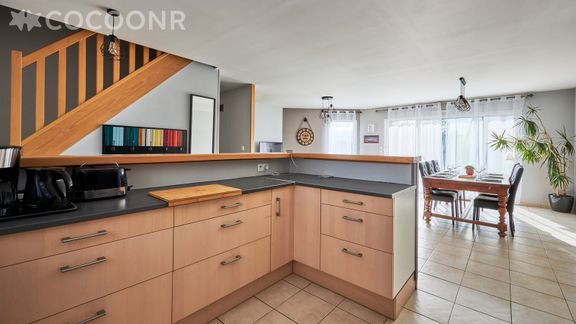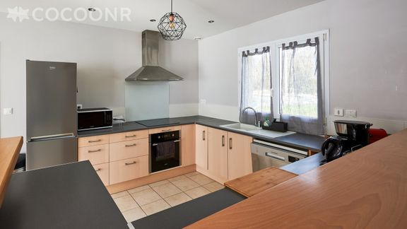 - Une cuisine ouverte équipée avec notamment : bouilloire électrique, four, four à micro-ondes, grille-pain, lave-vaisselle, plaques de cuisson...