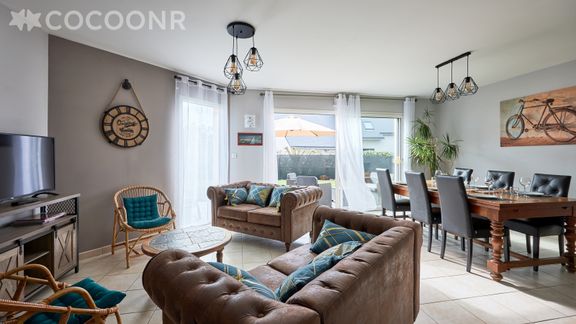 - Une pièce de vie de 40 m² avec TV, Wifi, canapés et espace repas.