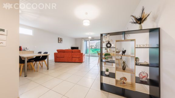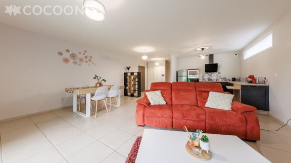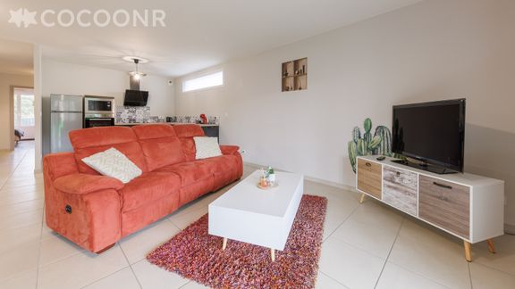 - Une pièce de vie de 40 m² avec TV, canapé et espace repas
