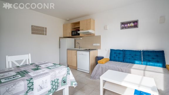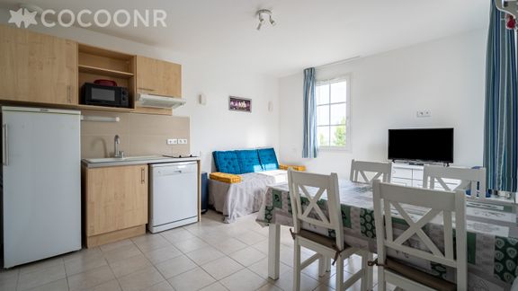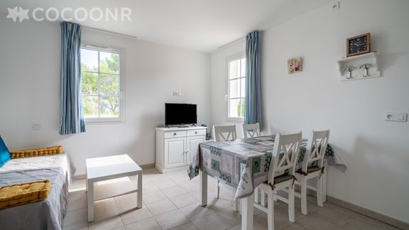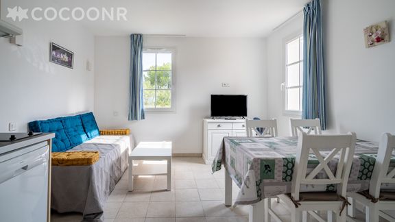 - Une pièce de vie de 15 m² avec TV, canapé-lit gigogne et coin repas