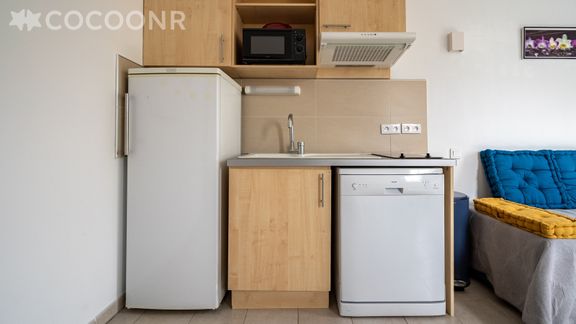- Une kitchenette équipée avec notamment : bouilloire électrique, four à micro-ondes, grille-pain, lave-vaisselle, plaques de cuisson, cafetière à dosettes Senseo...