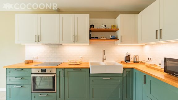 - Une cuisine de 30 m², équipée avec notamment : bouilloire électrique, four, four à micro-ondes, grille-pain, lave-vaisselle, plaques de cuisson... et son espace repas