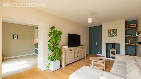 - Une pièce de vie de 30 m² avec TV, canapé et cheminée (bois non fourni)