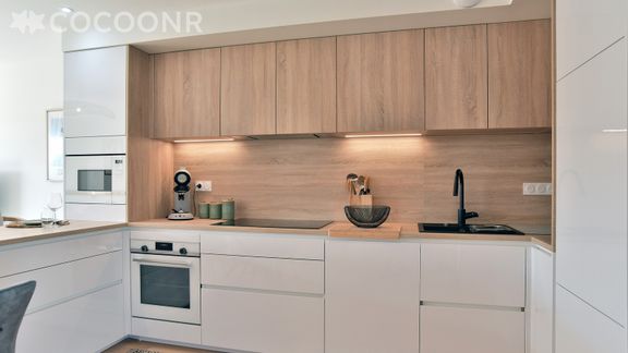 - Une cuisine équipée avec notamment : bouilloire électrique, four, four à micro-ondes, grille-pain, lave-vaisselle, plaques de cuisson...