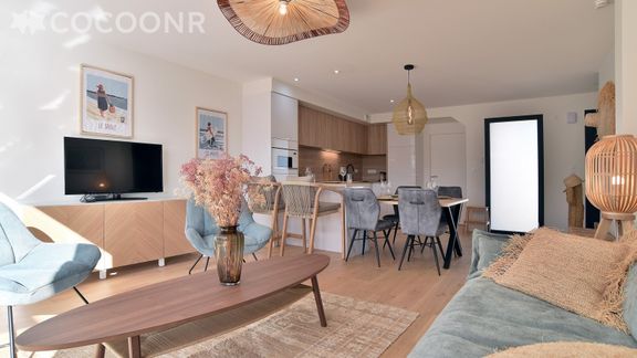 - Une pièce de vie de 36 m² avec canapé, TV et coin repas