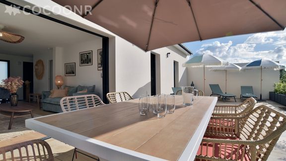Superbe maison décorée avec goût, baies vitrées s’ouvrant totalement sur une magnifique terrasse plein sud complétée de transats et d’un grand parasol,