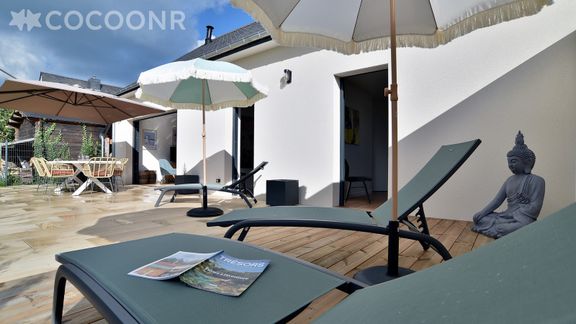 - Une terrasse de 60 m², exposée sud, avec mobilier pour profiter des beaux jours : table et chaises de jardin pour 8 personnes, 3 chaises longues avec parasols individuels et un grand parasol pour la table.
