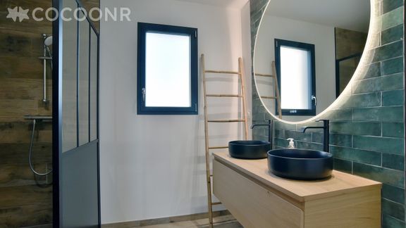 - Une salle de bain avec douche et WC