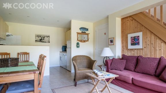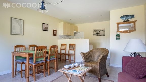 - Une pièce de vie de 25 m² avec TV, canapé convertible (double), fauteuil et un espace repas pouvant accueillir jusqu'à 6 personnes.