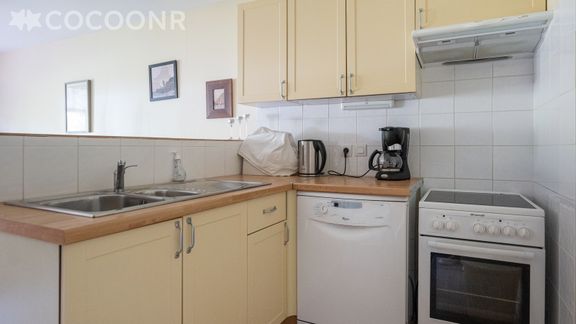 - Une cuisine ouverte équipée avec notamment : bouilloire électrique, four, four à micro-ondes, grille-pain, lave-vaisselle, plaques de cuisson, machine à café à filtre...