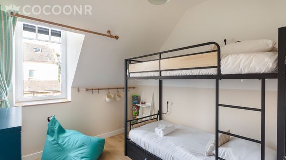 - Deux chambres, l'une avec 2 lit superposés et l'autre avec 1 lit queen-size (160×200).