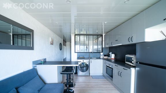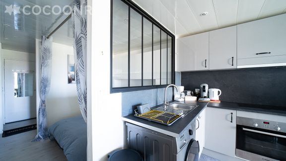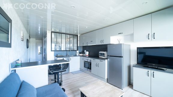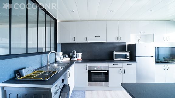 - Une cuisine ouverte équipée avec notamment : bouilloire électrique, four, four à micro-ondes, grille-pain, plaques de cuisson...