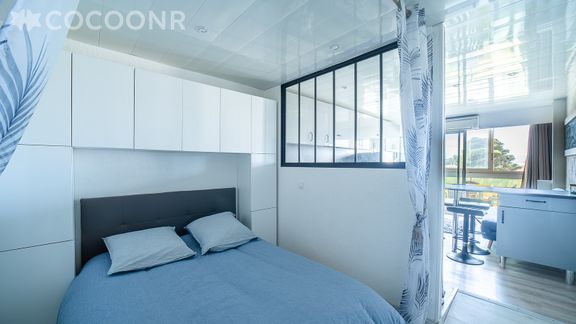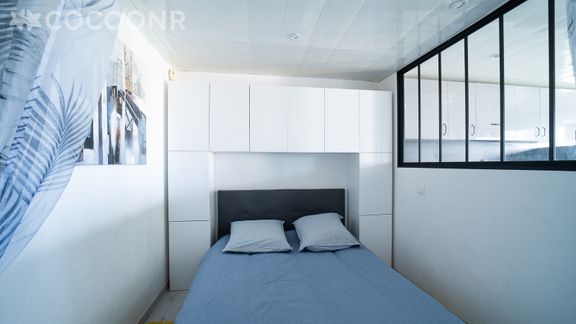- Un espace avec un lit double (140×190) ,séparé par un rideau, vue séjour avec verrières