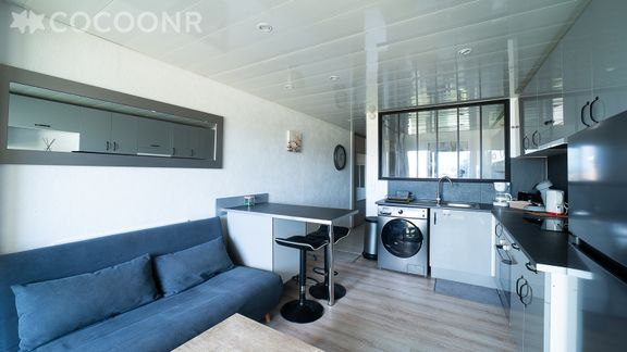 - Une pièce de vie de 10 m² avec canapé-lit double, espace repas, TV...