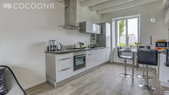 - Une cuisine moderne ouverte sur le salon, entièrement équipée : four, micro-onde, plaques, frigidaire, machine Nespresso et café filtre, lave-vaisselle